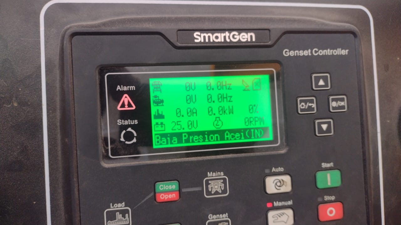 Descripción del problema: El generador PESATTO puede presentar una alarma de "Baja Presión Aceite (IN)" en el Smartgen. Esto puede ocurrir cuando el sistema de combustible está vacío o parcialmente lleno de aire debido a que el generador se ha quedado sin diésel o al realizar un cambio de filtros. En este caso, se requiere purgar el sistema de combustible para eliminar el aire y restablecer la presión de combustible adecuada.